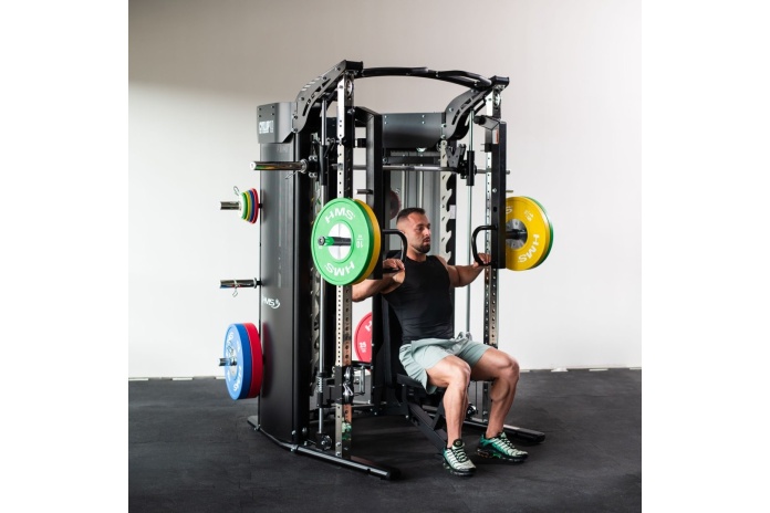Cyklop 10 HMS to zaawansowany atlas treningowy 3w1, łączący suwnicę Smitha, power rack i bramę z wyciągami. Dzięki dwóm precyzyjnym stosom po 90 kg oraz mechanizmowi łączącemu gryf Smitha ze stosami, umożliwia trening zarówno na wolnym ciężarze, na stosie, jak i na obu jednocześnie. To rozwiązanie, które zastępuje kilka maszyn, idealne do oszczędności miejsca przy pełnym spektrum ćwiczeń.