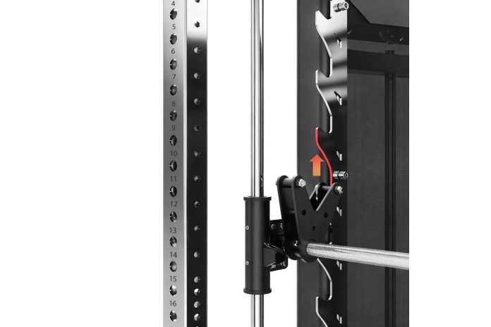 Unikalny system linek łączy gryf Smitha ze stosami, co pozwala szybko zmienić tryb treningu bez dokładania talerzy. Blokada bezpieczeństwa chroni przed niekontrolowanym opadnięciem gryfu, a stalowe kolumny umożliwiają szybkie odkładanie sztangi na dowolnej wysokości.