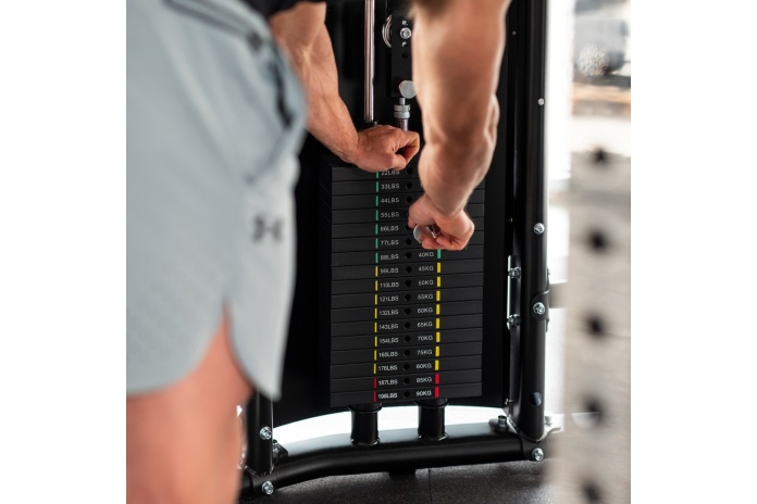Dwa niezależne stosy 2×90 kg pracują na łożyskowanych, aluminiowych rolkach. Krzyżowe przegubowe bloczki umożliwiają pełną regulację kierunku ciągnięcia, a skala otworów pozwala ustawić uchwyty dokładnie pod sylwetkę użytkownika.