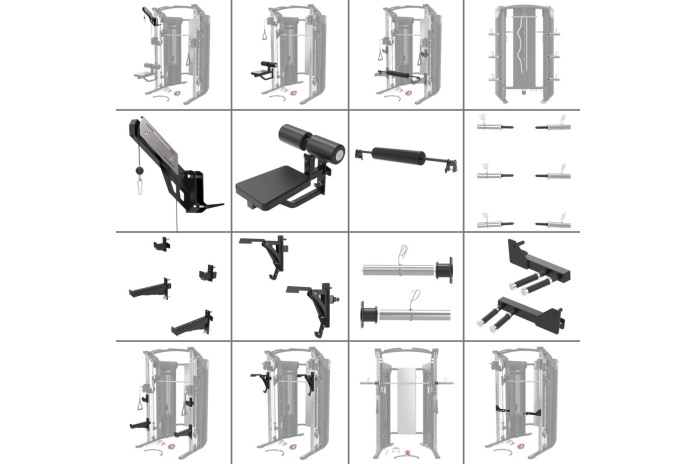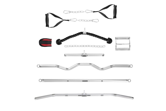 W zestawie uchwyty: 2× D-handle, sznur do tricepsa, podwójny uchwyt close-grip, łańcuchy, uchwyt na kostkę, prosty krótki uchwyt, drążek łamany (EZ), długi drążek prosty i skośny.