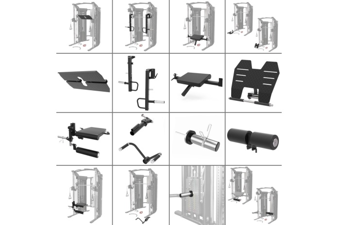 Atlas Cyklop 10 oferuje bogaty zestaw akcesoriów: przedłużenie wyciągu górnego, siedziska, blokady na uda, bolce na obciążenia, podpory bezpieczeństwa, monolift, nakładki na gryf Smitha, uchwyty do dipów, płytę do wypychania na nogi, ruchome ramiona (jammer arms), uchwyt landmine, siedzisko do prostowania nóg, płytę do brzuszków i inne.