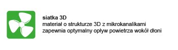 Zewnętrzna warstwa rękawic została wykonana z elastycznego materiału, który zapewnia pełną swobodę ruchów dłoni. Wnętrze rękawic wyposażono w żelowe wkładki, które skutecznie amortyzują wstrząsy i chronią przed urazami, nie ograniczając przy tym ich elastyczności. Część kciukowa pokryta jest chłonnym materiałem frotte, idealnym do wycierania potu, a specjalne pętelki wszyte między palce ułatwiają szybkie zdejmowanie rękawic.